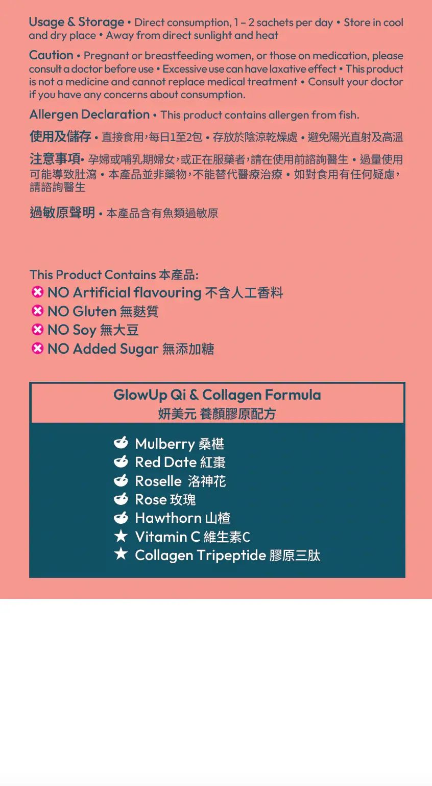 使用及儲存 • 直接食用,每日1至2包 • 存放於陰涼乾燥處 • 避免陽光直射及高溫 注意事項• 孕婦或哺乳期婦女,或正在服藥者,請在使用前諮詢醫生 • 過量使用可能導致肚瀉 • 本產品並非藥物,不能替代醫療治療 • 如對食用有任何疑慮,請諮詢醫生 過敏原聲明 • 本產品含有魚類過敏原